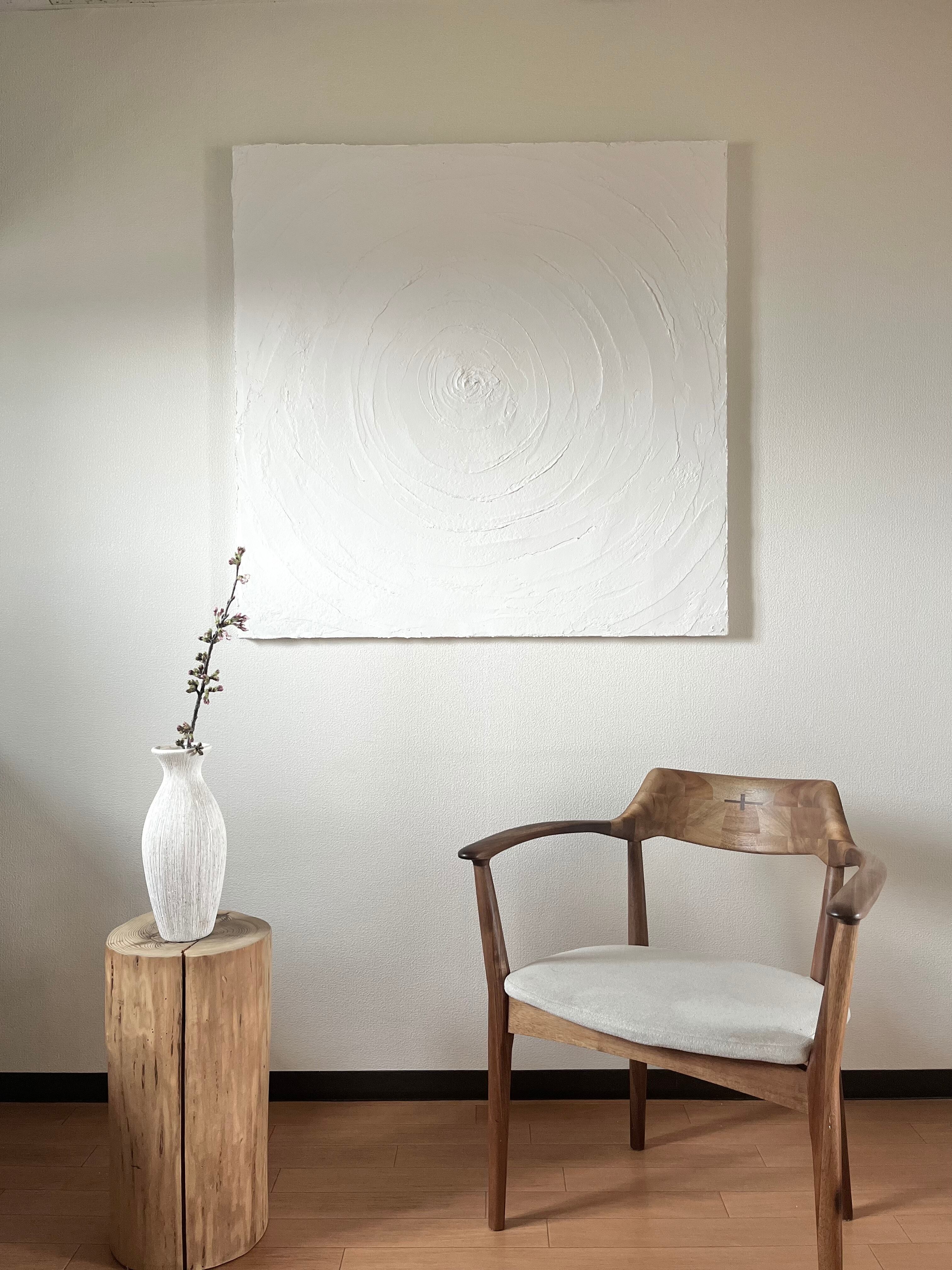 1000×1000の木製パネルに 漆喰を施しました。 時計と反対周りの円。 「解き放つ」ものをイメージ。 漆喰はサンゴ礁がルーツ。 広い海へ。 普通の壁でも これを一枚飾ることで いっきに部屋の雰囲気が変化します。 自分の家で飾りたいくらいの作品です。